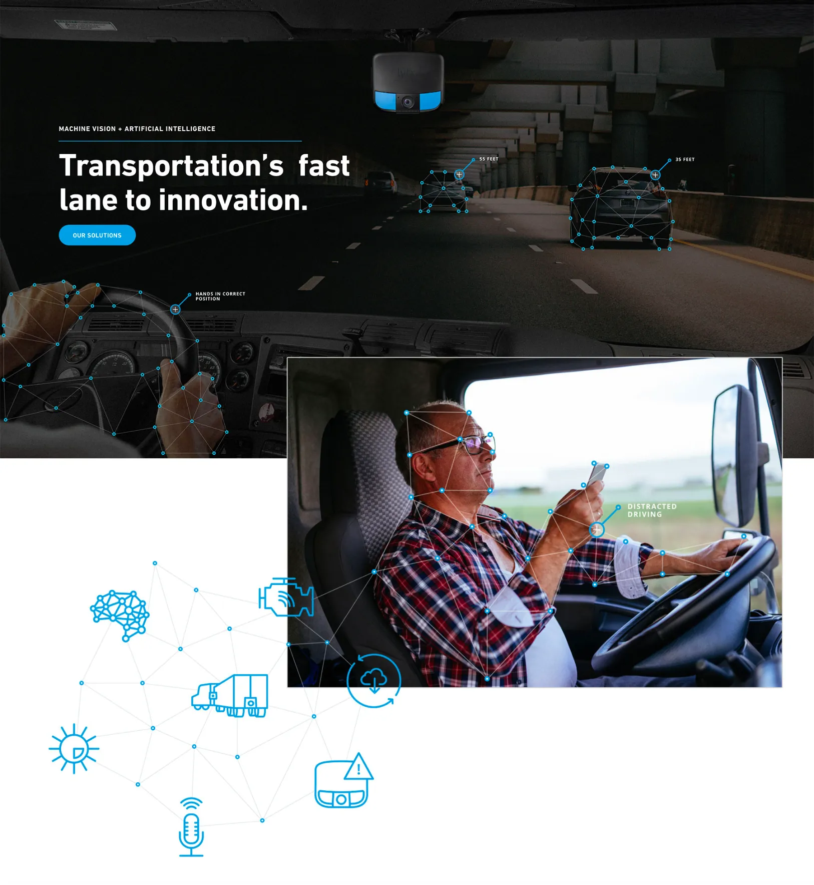 Our partnership with Lytx began by establishing a brand language that visually tells the story of what the software is capable of. Lytx offers cloud-connected dash cameras that provides video evidence with indisputable truth, which helps fleets exonerate their drivers and maintain profits by saving money on insurance claims. The platform itself tracks things like distracted driving, speeding, hard breaking and much more. To help illustrate the idea of video tracking Turn Agency designed neural nets to visually tell the story of fleet tracking using video data. We took the neural net idea even further using animation on the homepage to help further explain the concept.